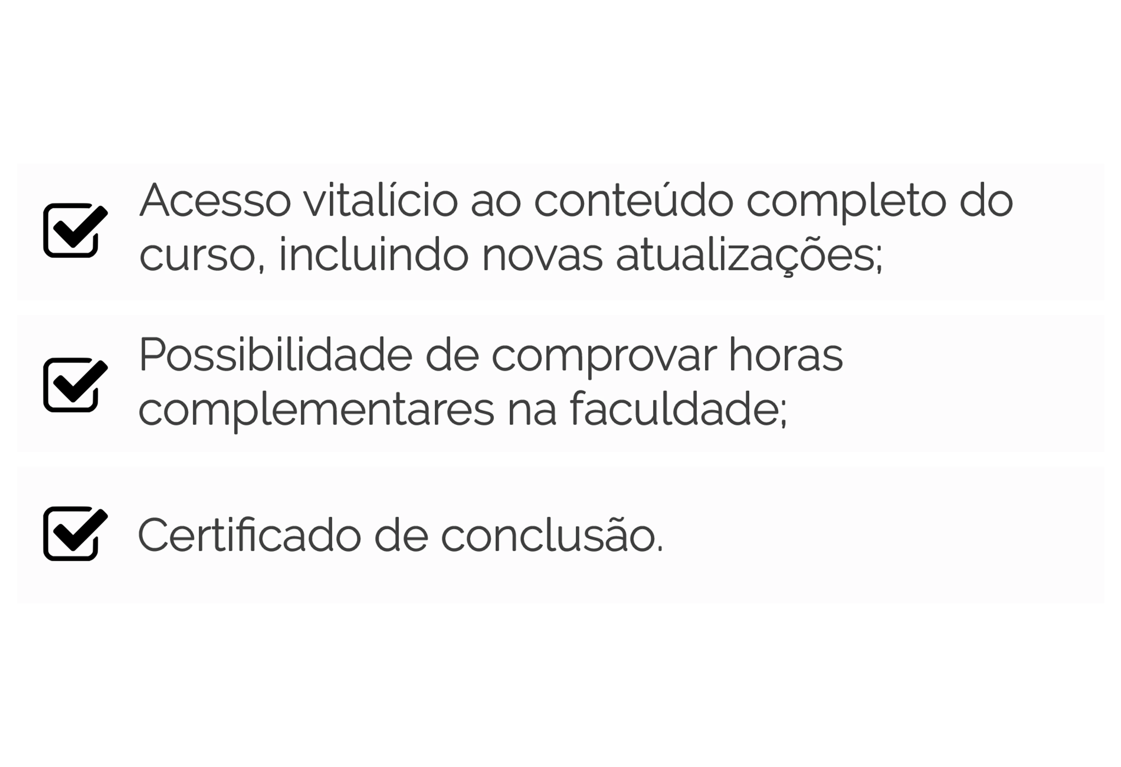 As informações contidas neste produto não devem ser interpretadas como promessa ou garantia de resultados. Seu progresso dependerá da sua dedicação em aplicar o conteúdo e seguir o método proposto. O curso oferece 7 dias de garantia para que você possa conhecer o material com tranquilidade e avaliar se ele atende às suas expectativas. Essa política foi criada para apoiar decisões conscientes e valorizar o conteúdo cuidadosamente desenvolvido — e não como um acesso temporário ao conteúdo completo. Este curso pode ter seu valor reajustado no futuro. A compra agora garante acesso vitalício, com todas as atualizações incluídas.